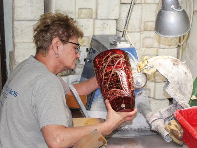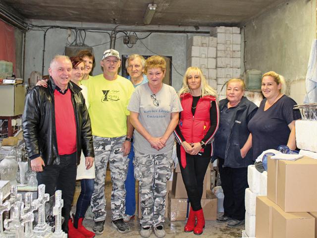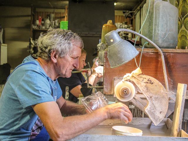 A műhelyben kisebb meglepetés éri az embert. Ahhoz képest, hogy üveget csiszolnak, nincs nagy zaj, se por. Három vidám hölgy és egy idősebb úr csiszolnak éppen, ki vázát, ki keresztet, ki tálat. A többiek is mind ott tüsténkednek: Horváthné Fehér Rózsa, Lakatos Mónika – aki alapítástól tagja a cégnek –, nekik oroszlánrészük van a dolgok vitelében és a minőség megtartásában. Munkájuk nagyban hozzájárult az elért sikerekhez. Szabó Zoltán, Meidl Zsuzsanna, Horváth Gyöngyi, Karai Ilona és Lukács Andrea is örömmel mutatta be, hogy mivel dolgozik. A szakemberek a kétrétegű, vörös és fehér vázán be is mutatják a mintázást. Impozáns, ahogy a különféle színekkel jelölt motívum-elemekből a szemünk előtt válik valódi minta. (Még a szomszédos gépen kiragasztott Joseph Jason Namakaeha Momoa szeme is nagyobb lett egy pillanatra.) A szomszéd szobában készülnek a homokfúváshoz a minták, amit a hölgyek, jelen esetben Satya felesége apró szikével alakít véglegesre.
