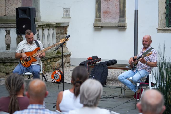A múzeumkert bensőséges terében különleges élmény kerekedett: Mits Gergely és keresztapja, egyben első mentora, Vörös Tamás léptek színpadra közösen. A kapcsolatuk több mint két évtizedre nyúlik vissza, és nemcsak szakmai, hanem személyes síkon is erős kötelék fűzi össze őket. Mits hosszú kihagyás után, sérült kézzel is vállalta a fellépést, mert – ahogy fogalmazott – az alkalom számára túl fontos volt: „Ő volt az első tanárom, és talán a legfontosabb – egy életre elég az a csomag, amit tőle kaptam.”