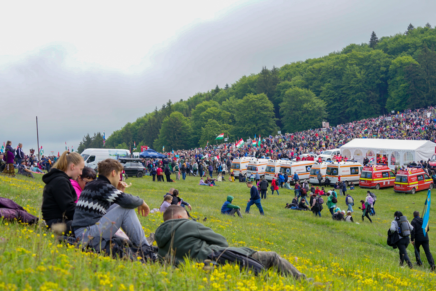 A pünkösdszombati esős reggel ellenére az idei búcsús nagymisére is több százezren érkeztek a Kis- és a Nagy-Somlyó hegy közötti nyeregbe, a Hármashalom-oltár elé a világ minden tájáról.