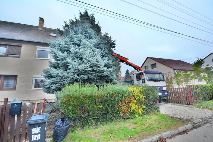 A Városgondnokság szakemberei kora reggel érkeztek az öreghegyi családi házhoz, amelynek előkertjében állt a fa. Szakszerű, gyors munkájuknak köszönhetően egy óra alatt autóra tették, majd a Belvárosba szállították.