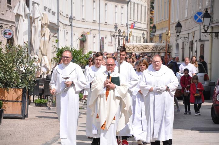 A szentmisét követően, az úrnapi körmenetben vitték végig az Oltáriszentséget a belvárosban. A virágokkal díszített oltárokhoz a város papsága, az asszisztencia, a zászlóvivők, a képviselő-testület tagjai, az énekkar és virágszóró kisgyerekek és hívők sokasága kísérték az Oltáriszentséget. A Szent Imre templomnál, a Püspöki Palota és a Ciszterci templom kapujában, valamint a Szent István Hitoktatási és Művelődési Ház bejáratánál felállított négy oltárnál közösen énekeltek, imádkoztak és egy-egy Evangélium-részletet olvastak fel. Ezután az ünnepi körmenet résztvevői visszatértek a Szent Imre templomba, ahol a püspöki áldásban részesültek.