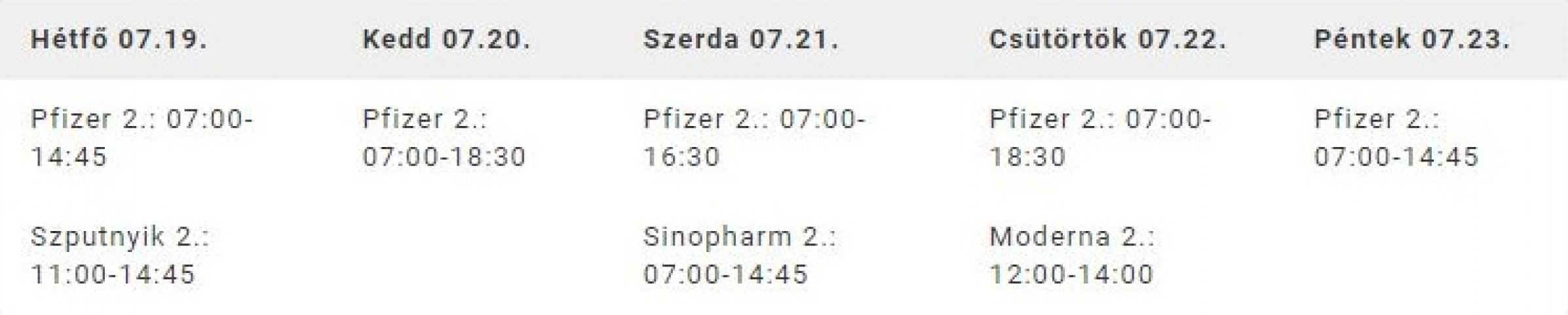 Július 26-tól, hétfőtől változik a Fejér Megyei Szent György Egyetemi Oktató Kórház oltópontjának nyitvatartása. A hónap utolsó hetétől hétfőn, szerdán, pénteken 7 és 15 óra, kedden és csütörtökön 11 és 19 között várják a pácienseket.